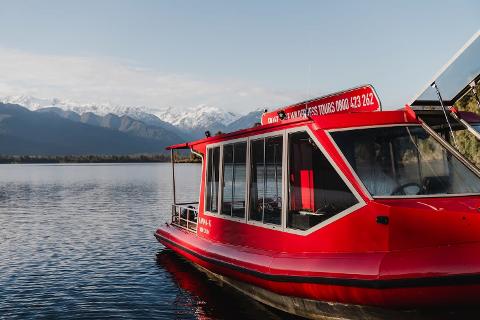 Explore Lake Mapourika on a personalised scenic cruise, where rainforest meets the Southern Alps in a calm setting within a UNESCO World Heritage landscape. Cruise across pristine tannin-filled water with uninterrupted glacier views, surrounded by one of the West Coast’s most peaceful environments – we’re often the only people out on the lake.